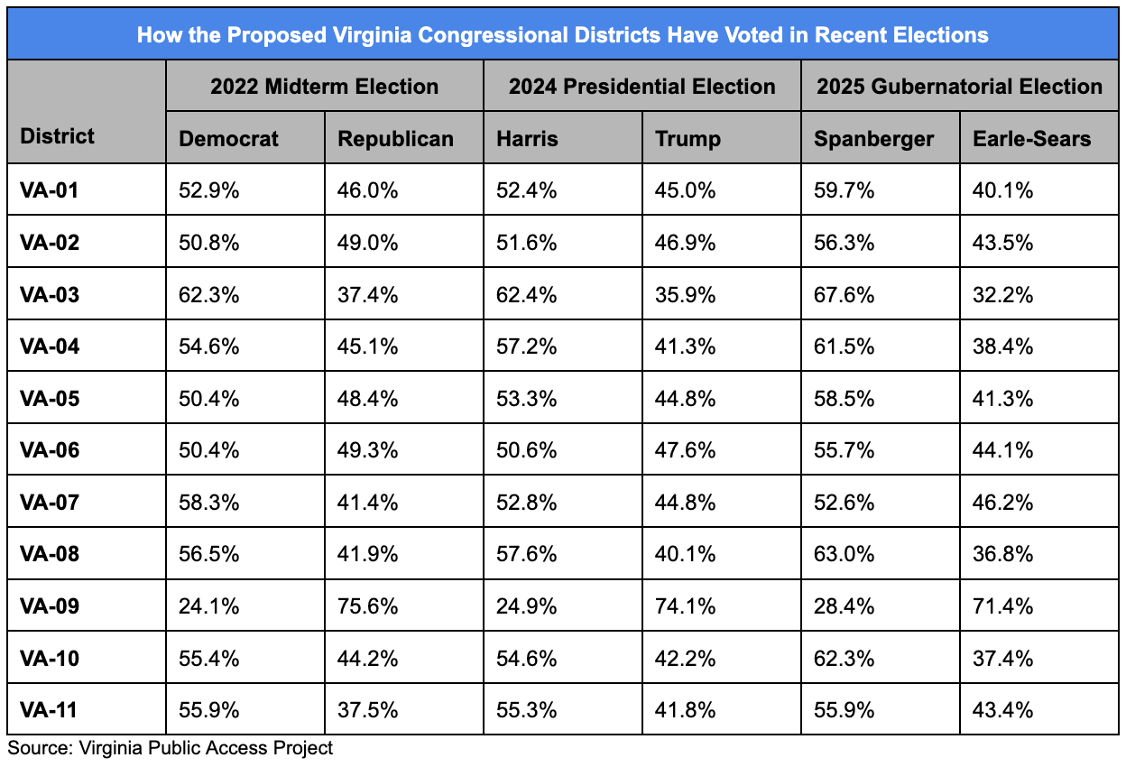 Democrats seemingly have looked at voters in the districts where they have had majorities in recent elections as committed partisans who won’t flip. Many may well be committed Democrats, but the majority of voters aren’t. There are plenty of independent voters in these districts. You also have to consider that Abigail Spanberger’s numbers are inflated because Winsome Earle-Sears was a uniquely bad candidate in a strong Democratic cycle. So, while these new districts may create a ten-to-one delegation in 2026. Will it be the same in 2028 or 2030, particularly if the hyperpartisan fever begins to break? It’s a gamble.